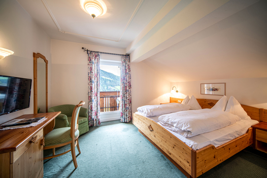 La camera ha circa 20 qm, arredata in stile rustico con balcone e vista sulle montagne.